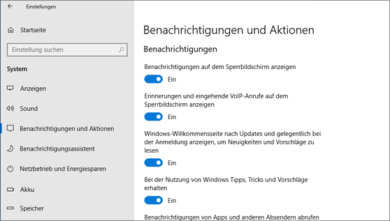 Wählen Sie Start und dann Einstellungen > System > Benachrichtigungen und Aktionen.